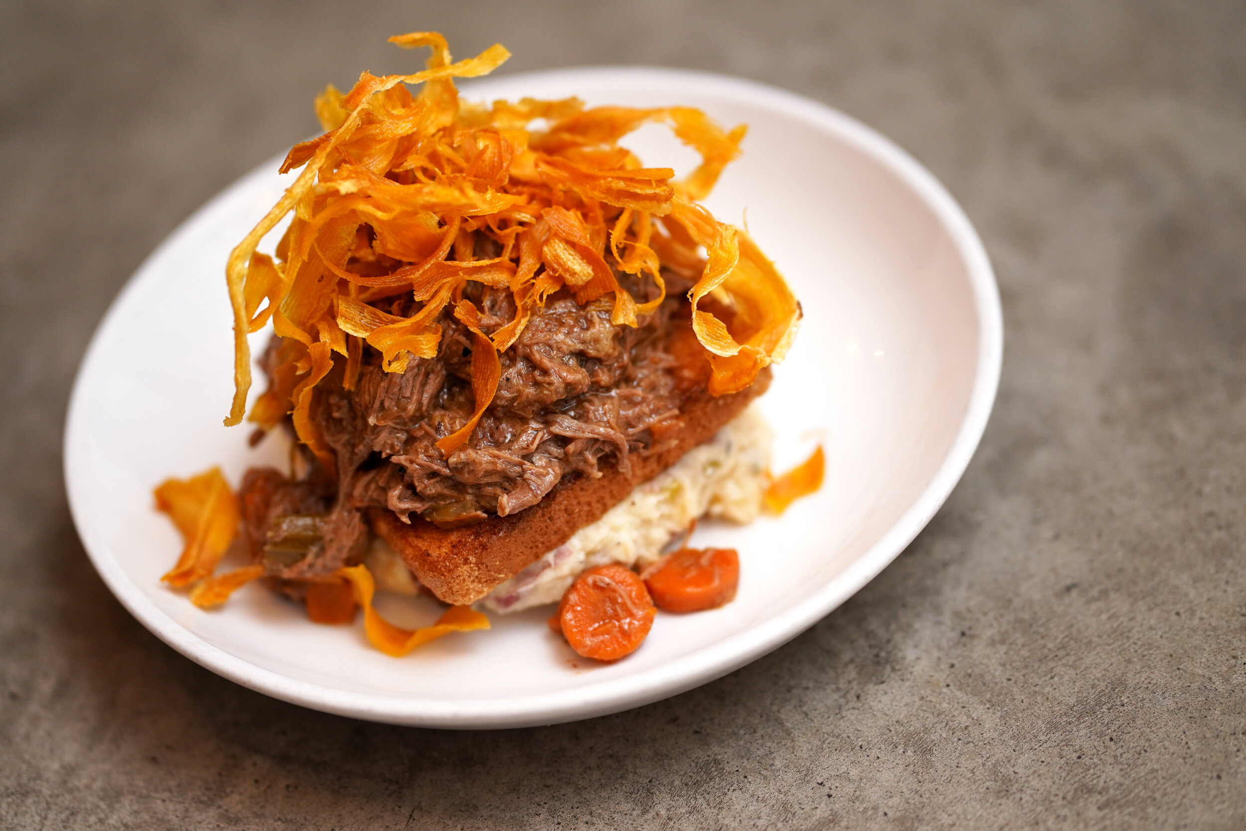 16 hour braised roast beef, served open faced on Texas toast on top of our smashed potatoes all smothered in brown gravy with your choice of one side.